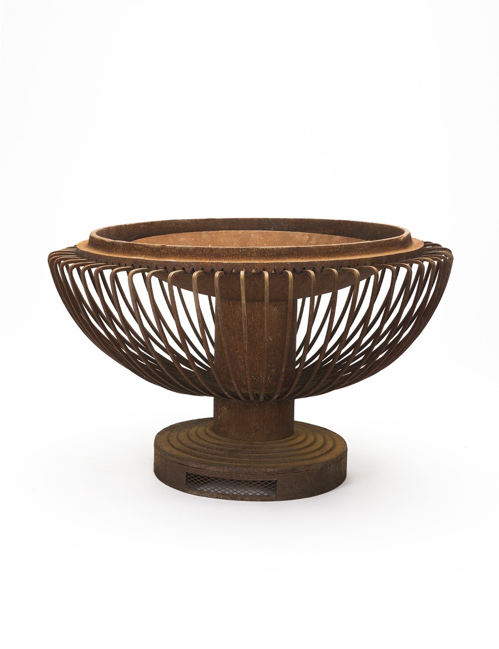 Basado en la secuencia de elementos circulares concéntricos, nace Meridianos de Fire Art. Pieza creada con un diseño escultórico donde se toma un elemento industrial como estructura del cual se desprenden varillas en forja. Cumple una doble funcionalidad, la de fogata y asador.